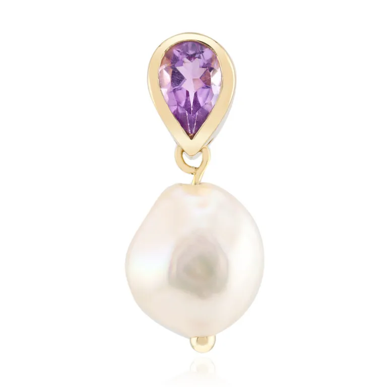 Entdecken Sie die Eleganz dieses atemberaubenden Anhängers mit einer weißen Süßwasserperle in Fantasieform und einem funkelnden brasilianischen Amethysten im Birnenschliff. Er ist mit 925er Sterlingsilber vergoldet und strahlt Raffinesse und Charme aus. Perfekt, um Ihre Abendgarderobe aufzuwerten oder einen Hauch von Luxus in Ihr Alltagsoutfit zu bringen. Ein vielseitiges Accessoire für jede Schmucksammlung.