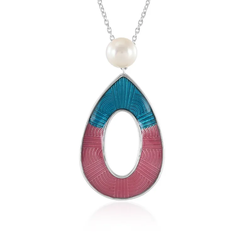 Dieser verführerische Anhänger präsentiert eine 7 mm große, runde Süßwasserperle aus China, die anmutig an einer Sterlingsilberkette hängt. Der Anhänger hat ein auffälliges tropfenförmiges Design mit einer fesselnden Mischung aus blaugrünen und rosaroten Farbtönen und ist wunderschön in 925er Sterlingsilber gefasst, das ungefähr 4,8 Gramm wiegt. Diese Halskette ist ideal, um Ihrer Kleidung einen Hauch von Raffinesse zu verleihen. Sie kann sowohl mit Tages- als auch mit Abendkleidung kombiniert werden und ist somit ein vielseitiges Accessoire für jede Schmucksammlung.