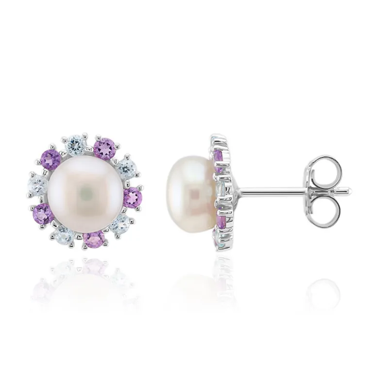 Entdecken Sie den Charme dieser exquisiten Ohrringe, die eine harmonische Mischung aus runden weißen Süßwasserperlen, himmelblauem Topas und leuchtendem Amethyst bieten. Diese 11 mm großen Ohrringe sind aus 925er Sterlingsilber gefertigt und strahlen Eleganz aus. Sie eignen sich perfekt für einen eleganten Abend oder ein schickes Tagesoutfit und werten jedes Outfit mit ihrem strahlenden Charme mühelos auf.