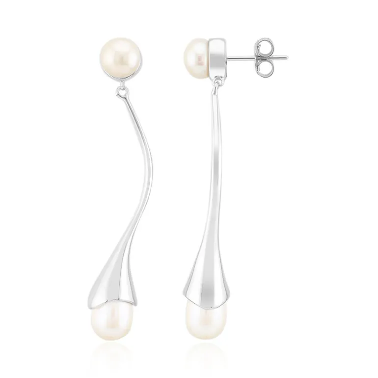 Entdecken Sie die Eleganz dieser Ohrringe aus Sterlingsilber mit erlesenen weißen Süßwasserperlen aus China. Das einzigartige Design kombiniert ausgefallene und runde Formen und schafft so einen raffinierten Look, der perfekt für Abendgarderobe oder formelle Anlässe ist. Sie sind leicht und anmutig und passen mühelos zu eleganten Kleidern oder schickem Business-Outfit und verleihen Ihrem Ensemble einen Hauch von Klasse.