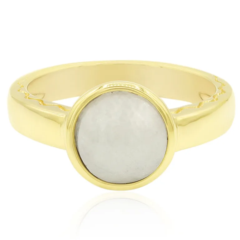 Entdecken Sie die ruhige Schönheit dieses Rings aus vergoldetem 925er Sterlingsilber, der einen glänzenden weißen Jadeit-Cabochon von 1,95 Karat aus Myanmar präsentiert. Der runde Cabochon mit einer Größe von ca. 8 mm ist anmutig in ein hochglanzpoliertes, vergoldetes Band eingefasst und wiegt etwa 2,68 Gramm. Das zeitgemäße Design erinnert an klassische Eleganz und eignet sich sowohl für den täglichen Gebrauch als auch für besondere Anlässe. Kombinieren Sie ihn mit einer frischen weißen Bluse oder einem Cocktailkleid, um seine zeitlose Ausstrahlung zu unterstreichen.