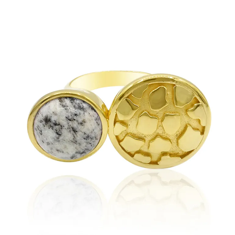 Dieser opulente Ring ist mit einem bezaubernden weißen Jaspis von 4,392 Karat aus Madagaskar besetzt, der in hochwertiges 925er Sterlingsilber mit einer glänzenden Goldplattierung gefasst ist. Der runde Edelstein im Cabochon-Schliff ist in einer eleganten Lünette gefasst und besticht durch sein zeitgemäßes Design, das perfekt für moderne Modebegeisterte ist. Unterstreichen Sie Ihr Outfit mit diesem Schmuckstück bei jedem Anlass, vom legeren Brunch bis zur raffinierten Dinnerparty.