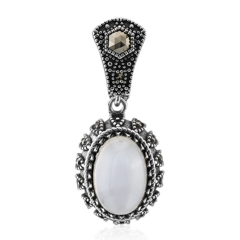 Versetzen Sie sich in eine Ära zeitloser Eleganz mit diesem Anhänger aus Sri Lanka mit Mondstein im Vintage-Look. Der aus Sri Lanka stammende ovale Cabochon-Mondstein mit einem Gewicht von 3,1 Karat strahlt einen geheimnisvollen Charme aus, der durch eine komplexe Anordnung von funkelnden österreichischen Markasiten im Sechseck- und Rundschliff mit einem Gesamtgewicht von 0,416 Karat ergänzt wird. Der 3,95 g schwere Anhänger ist aus hochwertigem 925er Sterlingsilber gefertigt und setzt mit seinem antik inspirierten Design einen raffinierten Akzent. Der vielseitige Varioclip sorgt dafür, dass er jede Kette Ihrer Wahl schmücken kann. Perfekt, um der Abendgarderobe einen Hauch von Raffinesse zu verleihen oder um bei gesellschaftlichen Anlässen für Gesprächsstoff zu sorgen.