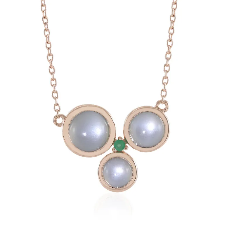 Entdecken Sie den himmlischen Glanz unserer veredelten indischen Mondstein-Halskette aus rosévergoldetem 925er Sterlingsilber. Dieses Schmuckstück mit einem Gesamtgewicht von 2,82 Karat besteht aus einem harmonischen Trio von weißen Mondsteinen im Cabochon-Schliff, die von einem brasilianischen Smaragd dezent akzentuiert werden. Tragen Sie dieses vielseitige Schmuckstück zu einer weißen Bluse oder zu einem eleganten Abendkleid, um Ihrem Outfit einen Hauch von raffiniertem Charme zu verleihen.