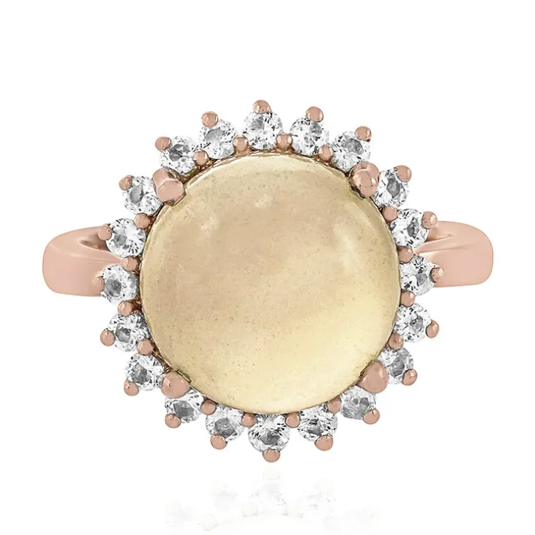 Dieser Ring aus rosévergoldetem 925er Sterlingsilber bezaubert durch seinen himmlischen Charme. Er ist mit einem exquisiten indischen Mondstein von 4,75 Karat besetzt. Sein Halo aus funkelnden weißen Topasen aus Madagaskar von insgesamt 0,444 Karat verstärkt die mystische Anziehungskraft. Der runde Cabochon-Schliff des Mittelsteins schimmert sanft und wird zum Mittelpunkt eines jeden Ensembles. Dieses Schmuckstück ist ideal, um Ihrer Alltagskleidung einen Hauch von Romantik zu verleihen oder Ihre Abendgarderobe zu akzentuieren und verspricht, eine beliebte Ergänzung für jede Schmucksammlung zu sein.