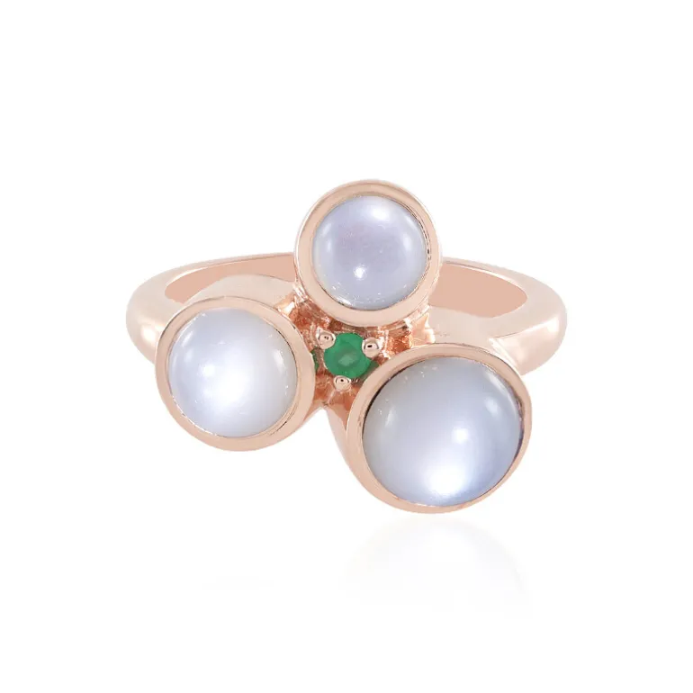 Entdecken Sie den himmlischen Charme unseres dreifachen Mondsteinrings aus der KM by Juwelo Kollektion. Ein Trio aus glatten Cabochon-Mondsteinen aus Indien mit insgesamt 2,82 Karat strahlt ein sanftes, beruhigendes Leuchten aus, das durch die warmen Farbtöne des 925er Sterlingsilbers mit einer zarten Roségoldplattierung ergänzt wird. Ein kleiner brasilianischer Smaragd mit einem Hauch von sattem Grün sorgt für einen Farbkontrast, der die Fantasie beflügelt. Dieser Ring eignet sich perfekt, um Ihrer Freizeit- oder eleganten Abendgarderobe einen subtilen, aber dennoch bezaubernden Touch zu verleihen und verspricht, ein begehrtes Stück in Ihrer Schmucksammlung zu werden.