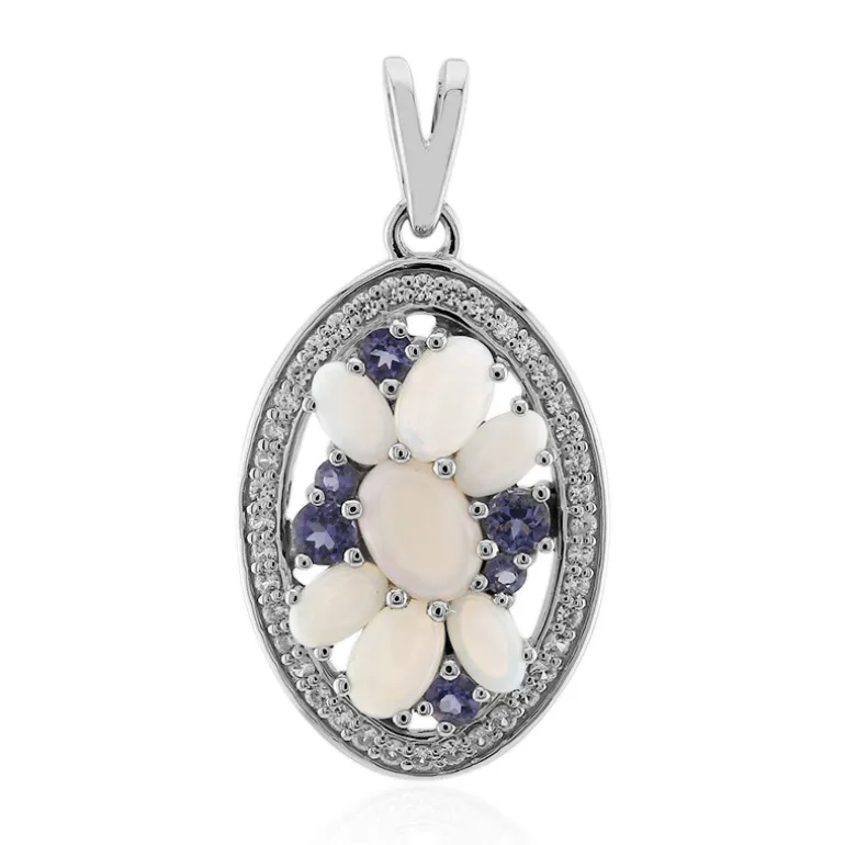Entdecken Sie die bezaubernde Anziehungskraft dieses Anhängers mit einer harmonischen Mischung aus australischen weißen Opalen und Iolithen aus Madagaskar, gefasst in glänzendes platiniertes Sterlingsilber. Der ovale Cabochon-Anhänger mit einem Gesamtgewicht von 2,266 Karat zeigt ein florales Mittelstück mit zarten Opalblättern, die von einem Reigen aus tiefblauen Iolithen und funkelnden Zirkonen umgeben sind und einen atemberaubenden Kontrast bilden. Dieser Anhänger ist ideal für besondere Anlässe oder zum Aufpeppen eines eleganten Outfits und ist ein Stück Luxus, das Sie in Ihrem Herzen tragen können.