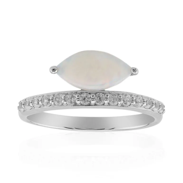 Entdecken Sie den ätherischen Charme dieses exquisiten Rings aus Sterlingsilber mit einem atemberaubenden Marquise aus australischem Weißopal von 0,429 Karat, der ein inneres Feuer ausstrahlt. Das Herzstück wird von 14 schimmernden Zirkonen aus Tansania mit einem Gesamtgewicht von 0,807 ct umrahmt. Dieses elegante Schmuckstück ist für zusätzlichen Glanz und Haltbarkeit mit Platin überzogen. Er ist das perfekte Accessoire für eine schicke Cocktailparty oder einen eleganten Abend und verspricht, das Licht und bewundernde Blicke auf sich zu ziehen.
