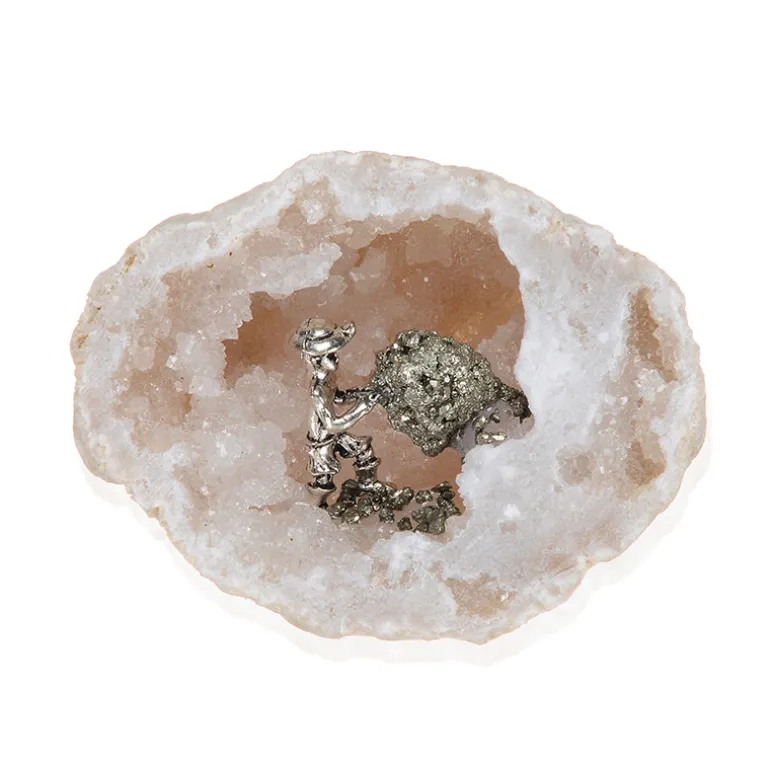 Entdecken Sie die natürliche Pracht dieser Geode aus marokkanischem Weißquarz mit funkelndem peruanischem Pyrit. Mit einem Gewicht von 850 ct, einem Fantasieschliff und einer Größe von ca. 81 x 64 mm ist diese Geode ein echtes Schmuckstück. Gepaart mit dem schimmernden Pyrit wiegt dieser dekorative Edelstein 50ct. Die Struktur aus einer Zinklegierung verleiht der Geode mit ihren erdigen Tönen einen subtilen Glanz. Sie eignet sich ideal für Sammler und Liebhaber der Inneneinrichtung und ist ein eindrucksvoller Blickfang oder ein durchdachtes Geschenk.