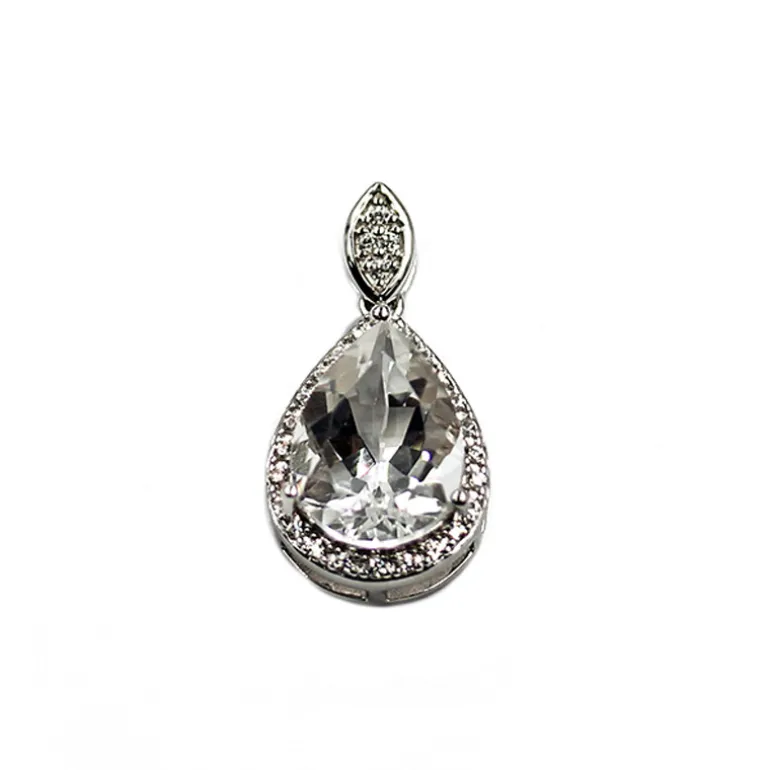 Dieser bezaubernde Anhänger präsentiert einen glänzenden, tropfenförmigen brasilianischen weißen Quarz von 4,089 Karat, der elegant von funkelnden kambodschanischen Zirkon-Akzenten von insgesamt 0,286 Karat eingerahmt wird. Dieses aus hochwertigem 925er Sterlingsilber gefertigte Schmuckstück ist ein Beispiel für raffinierten Geschmack. Seine Vielseitigkeit macht ihn zu einem zeitlosen Accessoire, das sowohl tagsüber als auch abends getragen werden kann. Dieser Anhänger ist ideal, um Ihrem Ensemble einen Hauch von Glamour zu verleihen, und wird ein geschätzter Teil Ihrer Schmucksammlung werden.