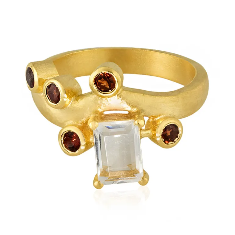 Brasilianischer weißer Quarz & Granat Goldplattierter Ring, 1,4ct