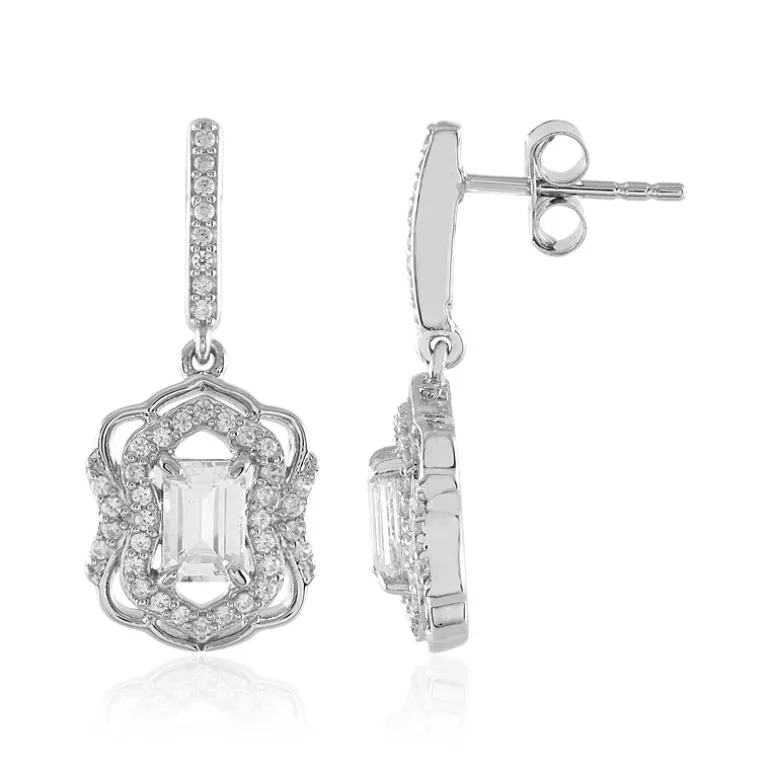 Diese leuchtenden Ohrringe zeigen die Eleganz weißer Saphire aus Madagaskar, die von funkelnden Zirkonen aus Kambodscha ergänzt werden. Die platinierte Basis aus 925er Sterlingsilber mit 1,066 Karat Saphiren im Oktagon-Schliff und 0,573 Karat Zirkonen im Rundschliff verleiht den 26 mm langen Ohrringen einen Hauch von Eleganz. Er eignet sich sowohl für besondere Anlässe als auch als glamouröser Begleiter im Alltag.
