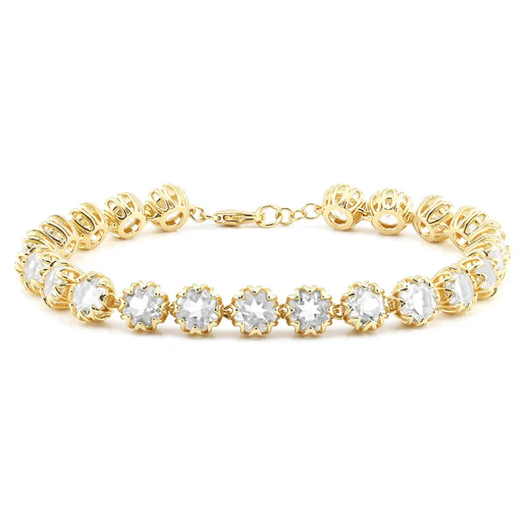 Ein Armband, das Eleganz ausstrahlt, mit 22 weißen Topas-Edelsteinen aus Nigeria. Jeder Edelstein ist meisterhaft in eine runde Form von 6 mm geschliffen und in luxuriöses vergoldetes 925er Sterlingsilber gefasst. Mit einem Gewicht von ca. 10,38 Gramm und insgesamt 20,592 Karat ist dieses 18,4 cm lange Armband perfekt für besondere Anlässe oder zur Aufwertung von Alltagsoutfits. Kombinieren Sie es mit einem raffinierten Kleid oder einem eleganten Ensemble für einen atemberaubenden Look.