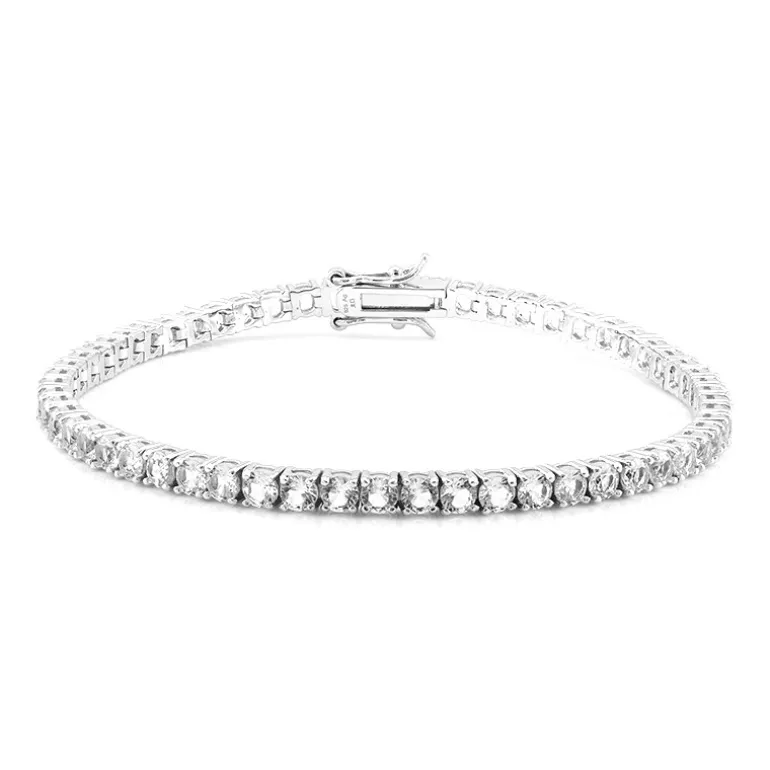 Schmücken Sie Ihr Handgelenk mit diesem strahlenden Armband aus 925er Sterlingsilber, besetzt mit 58 weißen nigerianischen Topasen im Rundschliff von insgesamt 6,525 Karat. Jeder 3 mm große Topas-Edelstein ist fachmännisch facettiert, um das Licht einzufangen, und bietet ein schillerndes Funkeln, das jedes Outfit ergänzt. Dieses exquisite Schmuckstück, das sich sowohl für legere als auch für formelle Anlässe eignet, verkörpert zeitlose Eleganz und ist ein Muss für Ihre Schmucksammlung. Mit einer Länge von ca. 18,5 cm passt es sich den meisten Handgelenken an.