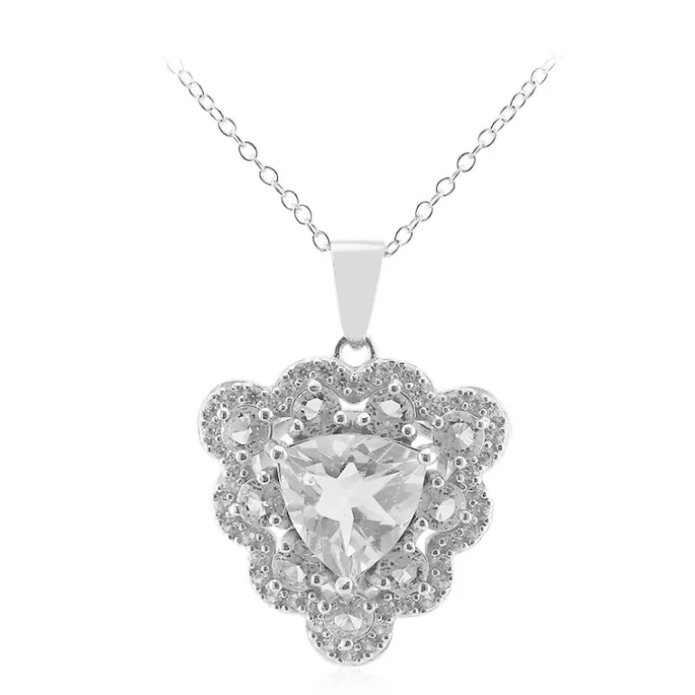 Zelebrieren Sie Raffinesse mit dieser Halskette mit nigerianischem Weißtopas aus glänzendem 925er Sterling Silber. Mit einem atemberaubenden zentralen Edelstein im Trilliant-Schliff von 2,475 Karat, der von einer Kaskade von Topasen im Rundschliff von 1,013 Karat umgeben ist, ist dieses Stück ein Zeugnis der Eleganz. Das zusätzliche Funkeln kommt von 45 Zirkonen im Rundschliff aus Tansania mit einem Gesamtgewicht von 0,324 Karat. Mit einem Gesamtkaratgewicht von 3,812 Karat und einer zeitgemäßen Anhängergröße von 26×20 mm ist diese Halskette vielseitig von morgens bis abends tragbar. Sie lässt sich mit einer 45,5 cm langen Kette bequem um den Hals tragen und setzt jedes Outfit elegant in Szene.