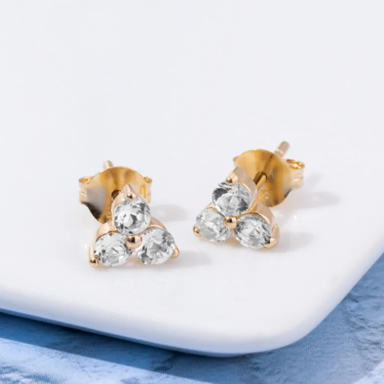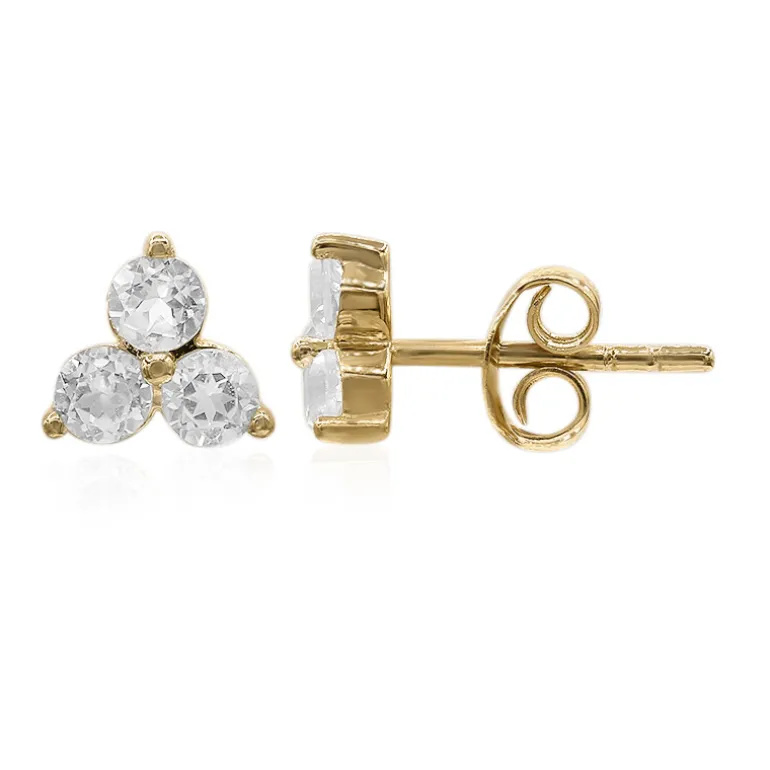 Genießen Sie den Glanz dieser vergoldeten Sterlingsilber-Ohrringe mit sechs weißen Topasen im Rundschliff von insgesamt 0,702 Karat aus den reichen Landschaften Nigerias. Jeder Edelstein misst etwa 3 mm und ist in glänzendem 925er Sterlingsilber mit einer schimmernden Goldplattierung gefasst. Dieses Paar mit einem Gewicht von etwa 0,8 g ist eine zierliche und elegante Ergänzung für jedes Ensemble. Diese Ohrringe eignen sich perfekt, um Ihrer Alltagskleidung einen Hauch von Raffinesse zu verleihen oder ein Outfit für einen besonderen Anlass aufzuwerten. Sie sind eine zeitlose Wahl für alle, die zarte Schönheit zu schätzen wissen.