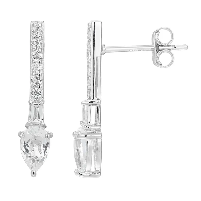 Diese eleganten Tropfenohrringe vereinen die Brillanz des brasilianischen weißen Topas mit der zeitlosen Schönheit von 925er Sterlingsilber. Mit einer prächtigen Anordnung von Edelsteinen im Birnen- und Fancy-Stufenschliff, ergänzt durch glitzernde Akzente im Rundschliff von insgesamt über 1 Karat, sind diese Ohrringe ein Zeugnis der Eleganz. Sie sind perfekt geeignet, um sowohl tagsüber als auch am Abend einen Hauch von Eleganz zu versprühen. Sie sind ein echter Blickfang und werden bei jeder Veranstaltung Komplimente ernten.