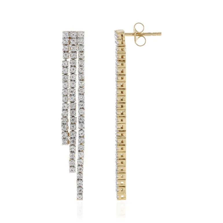 Diese Ohrringe aus vergoldetem 925er Sterlingsilber sind mit 120 weißen Topasen im Rundschliff aus Indien besetzt, die sich zu einem Gesamtgewicht von 2,259 Karat summieren. Jeder Ohrring fällt in einem eleganten Wasserfall aus funkelnden Steinen herab und misst eine beeindruckende Länge von 49 mm. Die exquisite Handwerkskunst fängt die Leuchtkraft jedes Topas ein und macht diese Ohrringe zu einer raffinierten Wahl für formelle Anlässe oder zur Aufwertung Ihrer Alltagskleidung.