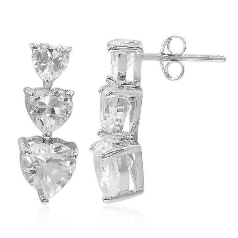 Entdecken Sie die Anziehungskraft dieser atemberaubenden Ohrringe mit einem Trio aus weißen nigerianischen Topas-Edelsteinen im Herzschliff, die elegant von jedem Ohrring herabhängen. Die mit Präzision gefertigten Ohrringe haben ein Gesamtgewicht von 5,503 Karat und sind in hochwertigem 925er Sterlingsilber gefasst. Die klaren Topas-Edelsteine bilden zusammen mit dem strahlenden Silber eine harmonische Mischung, die jedes Outfit ergänzt und sie sowohl für den Tag als auch für besondere Abende geeignet macht. Ihr herzförmiges Funkeln zieht das Auge in seinen Bann und ist ein Symbol der Liebe und Zuneigung, das sich perfekt als Geschenk oder als Ergänzung Ihrer persönlichen Schmucksammlung eignet.