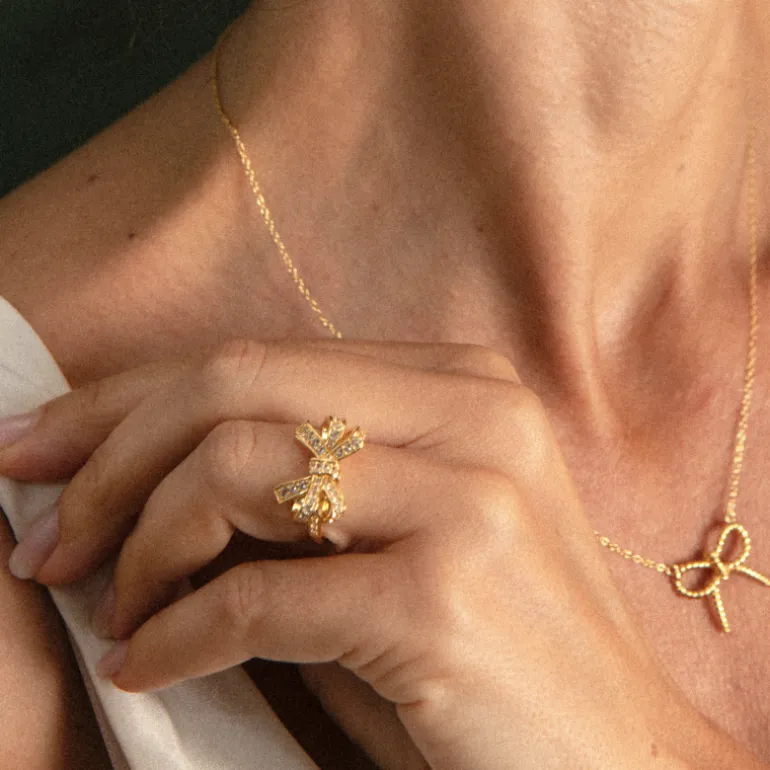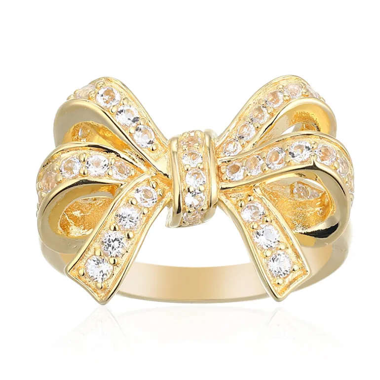 Entdecken Sie die Anziehungskraft unseres atemberaubenden bogenförmigen Rings, der aus vergoldetem 925er Sterling Silber gefertigt ist. Er verfügt über 52 funkelnde brasilianische weiße Topase im Rundschliff mit einem Gesamtgewicht von 0,529 ct, die sorgfältig gefasst wurden, um ein auffälliges Design zu schaffen, das sowohl Anmut als auch Raffinesse verkörpert. Dieses auffällige Schmuckstück mit seiner schillernden Anordnung von Edelsteinen und dem eleganten Schleifenmotiv ist das perfekte Accessoire für Feierlichkeiten oder um jedem Outfit einen Hauch von Glamour zu verleihen.