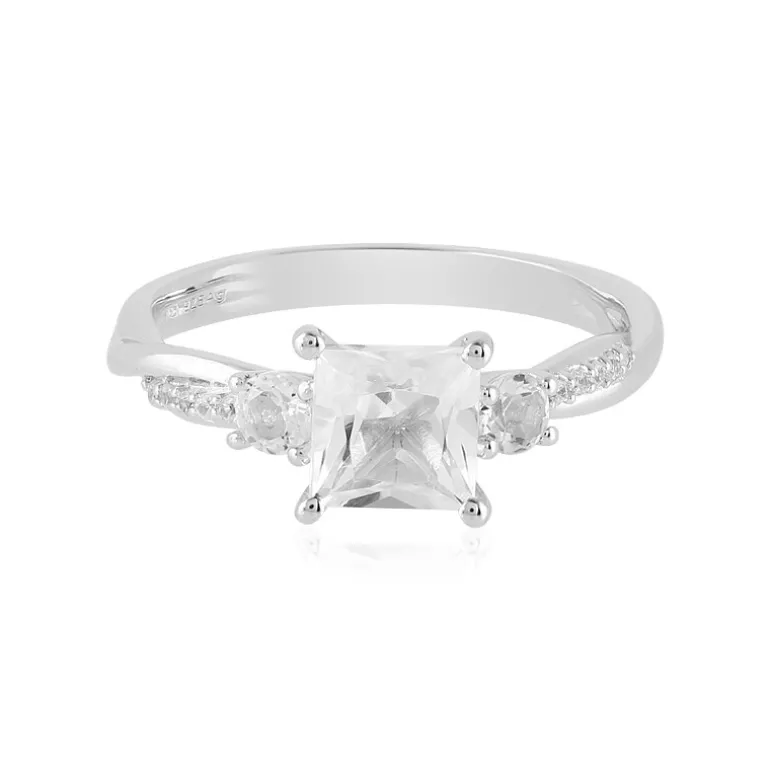 Dieser atemberaubende Ring zeigt einen brasilianischen weißen Topas in der Mitte, der durch einen Princess-Schliff akzentuiert wird, der seine Brillanz maximiert. Flankiert von zwei weißen Topasen im Rundschliff und einer Konstellation von Zirkonen aus Kambodscha, strahlt das Design Reinheit und Raffinesse aus. Das aus 925er Sterlingsilber gegossene Schmuckstück wiegt ca. 1,93 Gramm und bietet eine hohe Qualität mit einem zarten Griff. Dieser Ring ist ideal, um der Abendgarderobe einen Hauch von Eleganz zu verleihen oder der Alltagskleidung eine raffinierte Note zu verleihen. Er ist eine wertvolle Ergänzung für jede Sammlung.