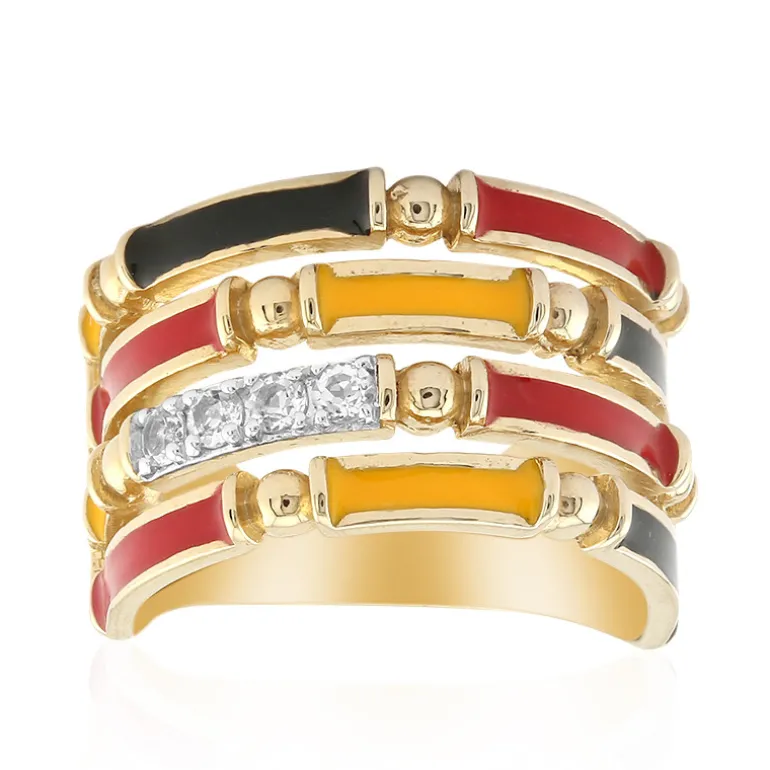 Entdecken Sie das Strahlen dieses atemberaubenden Rings aus vergoldetem 925er Sterlingsilber, der mit vier funkelnden brasilianischen Weißtopasen im Rundschliff von insgesamt 0,135 Karat besetzt ist. Mit seinem kühnen und farbenfrohen Design ist dieser Ring ein Beweis für raffinierte Eleganz und perfekt, um Ihren Lieblingsoutfits einen luxuriösen Touch zu verleihen. Die Streifen aus roter und gelber Emaille sorgen für einen verspielten Kontrast und machen dieses Schmuckstück zu einem echten Hingucker bei jeder Gelegenheit. Ob beim Ausgehen oder bei besonderen Anlässen, dieser Ring wird für Gesprächsstoff sorgen.