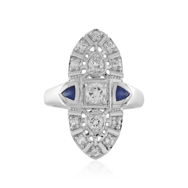 Dieser Ring aus 925er Sterlingsilber besticht durch seine Kombination aus weißem Topas aus Madagaskar und blauem Chalcedon aus Indien. 1,015 Karat Edelsteine in einem aufsehenerregenden Design. In der Mitte befindet sich ein Topas im Rundschliff, der von zwei blauen Chalcedonen im Trillant-Schliff akzentuiert wird und einen farblichen Kontrast bildet. Um die Mittelsteine herum sind mehrere Topase angeordnet, die dem Schmuckstück zusätzliche Brillanz verleihen. Dieser Ring ist perfekt, um Alltagsoutfits aufzuwerten oder Abendgarderobe mit seinem eleganten Reiz zu ergänzen.