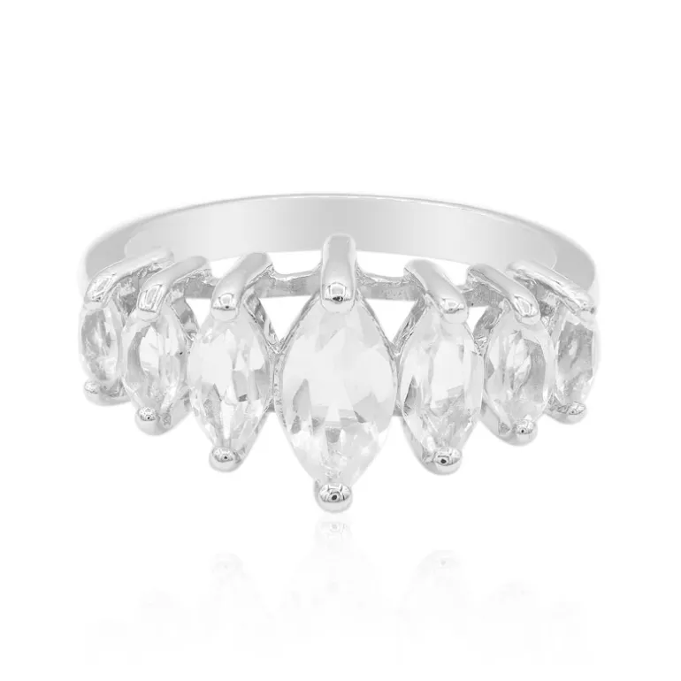 Lassen Sie sich vom Glanz dieses spektakulären Rings aus 925er Sterlingsilber verzaubern, der eine harmonische Anordnung nigerianischer weißer Topase von insgesamt 1,63 Karat zeigt. Die Edelsteine im Marquiseschliff glitzern in einer eleganten, symmetrischen Anordnung und fangen das Licht mit jeder Geste ein. Dieser Ring ist für diejenigen gedacht, die schlichte Eleganz bevorzugen, und lässt sich nahtlos vom Tag in den Abend übergehen. Kombinieren Sie ihn mit einer knackigen Bluse für einen eleganten Tageslook oder mit einem fließenden Abendkleid für eine bezaubernde Nacht.