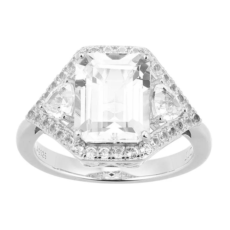 Entdecken Sie die Brillanz des brasilianischen Weißtopas mit diesem Ring aus 925er Sterlingsilber. Ein 2,973 Karat schwerer Topas im exquisiten Achteck-Stufenschliff wird von zwei Topasen im Trillant-Schliff mit insgesamt 0,396 Karat flankiert und von 34 Edelsteinen im Rundschliff mit insgesamt 0,246 Karat umrahmt. Mit einem Gewicht von etwa 3,33 g funkelt dieser Ring aus jedem Blickwinkel. Sein klassisches Design und sein monochromes Funkeln ergänzen jedes Outfit und eignen sich perfekt für elegante Abende oder für das Tragen am Tag.