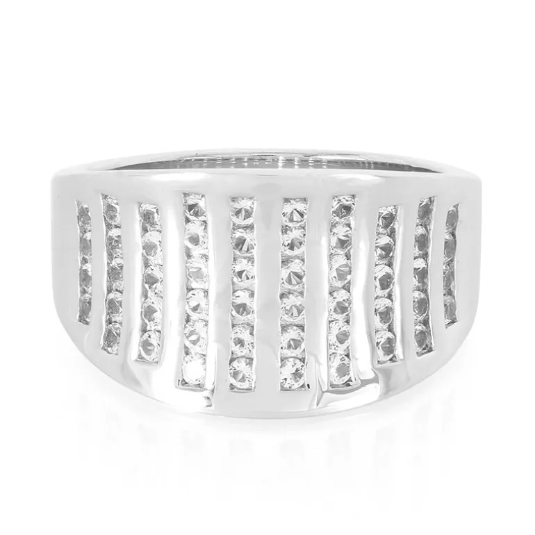 Entdecken Sie die Faszination dieses Rings mit brasilianischem Weißtopas, der sorgfältig aus hochwertigem 925er Sterlingsilber gefertigt ist. 52 runde Topase im Brillantschliff mit einem Gesamtgewicht von 0,722 Karat sind in präzisen Reihen angeordnet und erzeugen ein harmonisches Funkeln, das an eisige Eleganz erinnert. Das beträchtliche Silbergewicht von etwa 5,62 Gramm sorgt für ein Gefühl von Solidität und Luxus. Dieser Ring ist ideal für jede Gelegenheit und passt sowohl zu legeren als auch zu formellen Anlässen und verleiht Ihrem Ensemble einen Hauch von Eleganz.