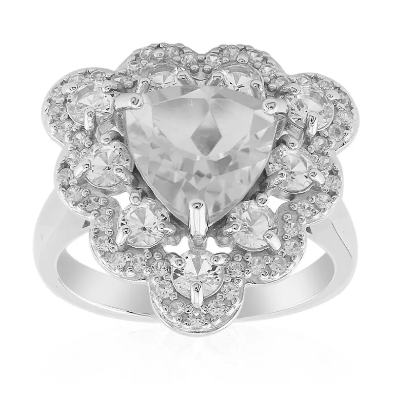 Lassen Sie sich von der funkelnden Eleganz dieses Rings aus 925er Sterlingsilber verzaubern, dessen Herzstück ein atemberaubender nigerianischer Weißer Topas von 2,475 Karat im Trilliant-Schliff ist, der etwa 9 mm misst. Um den zentralen Edelstein herum befinden sich 9 weiße Topase und 45 tansanische Zirkone mit einem Gesamtkaratgewicht von 3,812 ct, die für strahlende Brillanz aus jedem Blickwinkel sorgen. Das klassische Design mit dem einzigartigen Trilliant-Touch macht ihn zu einem vielseitigen Schmuckstück, das sowohl tagsüber als auch abends glamourös wirkt. Perfekt zum Verschenken oder um Ihrer Schmucksammlung einen Hauch von Raffinesse zu verleihen.