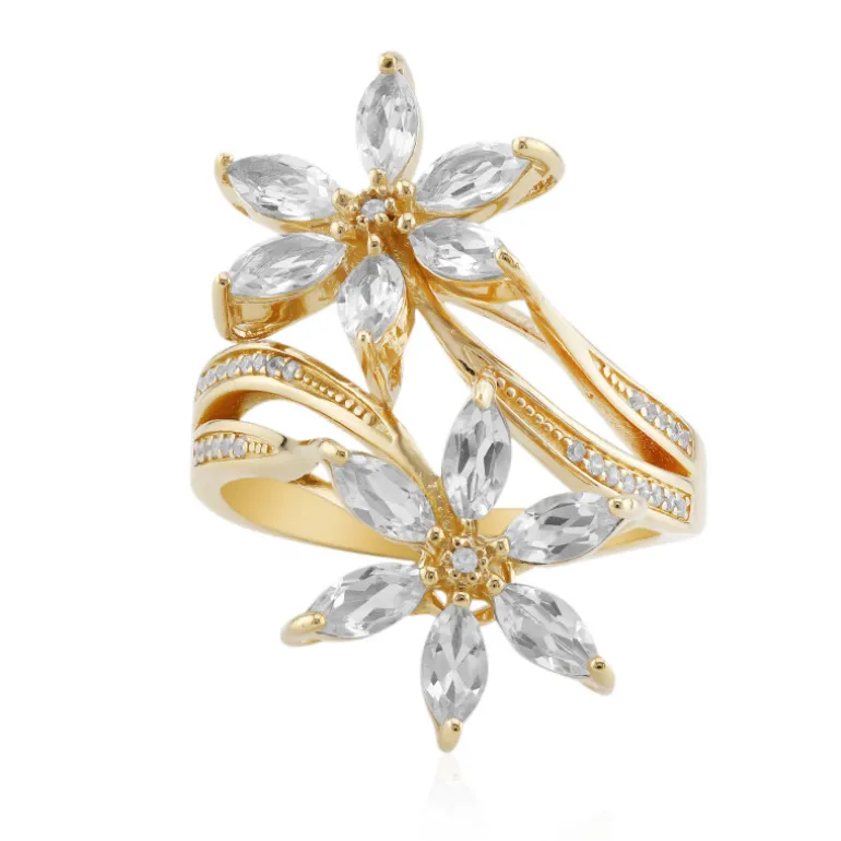 Entdecken Sie die Faszination dieses bezaubernden Rings aus vergoldetem 925er Sterlingsilber, der ein Bouquet aus 12 nigerianischen weißen Topasen im Marquiseschliff mit insgesamt 1,868 Karat präsentiert. Mit einem funkelnden Halo aus 28 Zirkonen im Rundschliff aus Tansania strahlt dieses Schmuckstück Raffinesse aus. Dieser Ring eignet sich perfekt, um Ihrer Abendgarderobe einen Hauch von Eleganz zu verleihen oder bei besonderen Anlässen ein Zeichen zu setzen. Er ist eine vielseitige Ergänzung für jede Schmucksammlung.