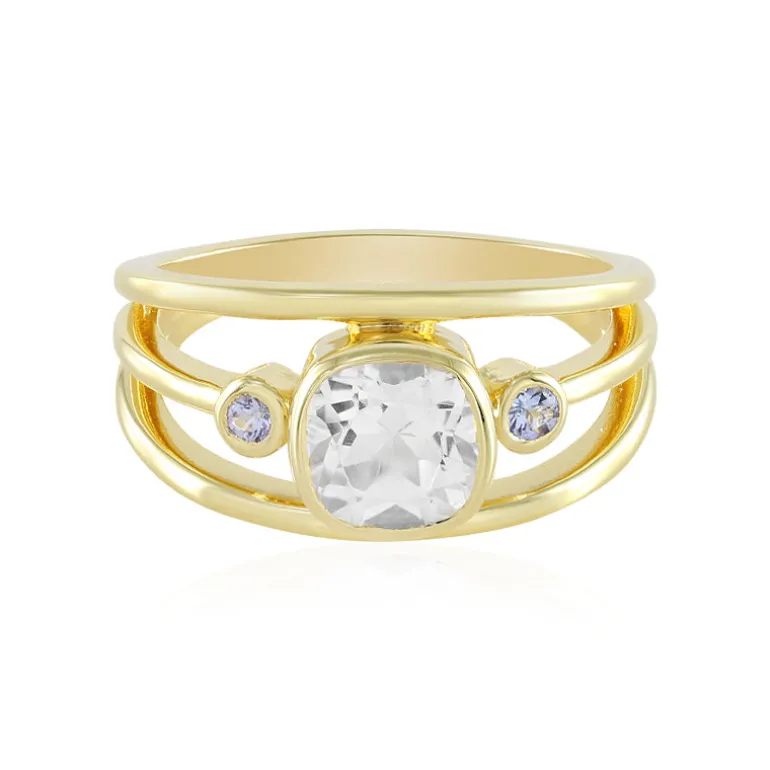 Entdecken Sie die Symphonie aus Funkeln und Wärme mit diesem vergoldeten Ring aus Sterlingsilber mit einem brasilianischen weißen Topas von 0,53 Karat im antiken Kissenschliff, flankiert von zwei Tansaniten im Rundschliff von insgesamt 0,129 Karat aus Tansania. Das elegante Design und die sanften Rundungen dieses 22×19 mm großen Rings machen ihn zu einer zeitlosen Ergänzung für jede Schmucksammlung. Er eignet sich perfekt für formelle Anlässe oder verleiht Ihrer Alltagskleidung einen Hauch von Raffinesse und ist eine vielseitige Wahl, die zu einem geschätzten Schmuckstück wird.