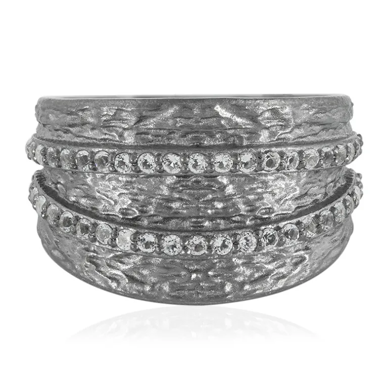 Dieser atemberaubende Ring zeigt die Brillanz von 42 brasilianischen weißen Topasen im Rundschliff mit insgesamt 0,479 Karat, die elegant in 925er Sterlingsilber mit einem Gewicht von ca. 6,27 Gramm gefasst sind. Das einzigartige, strukturierte Band, das an ineinander verschlungene silberne Ströme erinnert, ist ein echter Hingucker. Dieser Ring ist perfekt geeignet, um sowohl tagsüber als auch abends einen Hauch von Raffinesse zu verleihen und wird in jeder Schmucksammlung zu einem begehrten Stück.