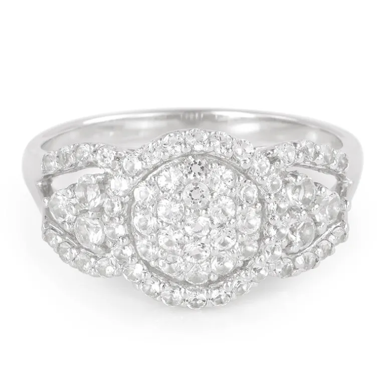 Tauchen Sie ein in die Pracht dieses Rings aus 925er Sterlingsilber, besetzt mit insgesamt 0,902 Karat strahlendem weißen Topas aus Brasilien. Der zentrale Cluster und die flankierenden Designs sind sorgfältig mit runden Steinen im Brillantschliff gearbeitet und schaffen eine funkelnde Collage aus Licht an Ihrem Finger. Die Hochglanzpolitur des Silbers sorgt für einen zusätzlichen Glanz, der den eisigen Schimmer des Topas ergänzt und sich sowohl für legere Eleganz als auch für formelle Anlässe eignet. Das filigrane Design von 24×19 mm sorgt dafür, dass dieser Ring auf jeder Veranstaltung für Gesprächsstoff sorgt.
