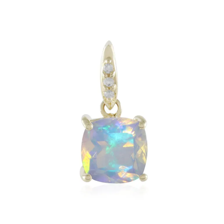 Erfreuen Sie sich an der zarten Opaleszenz dieses Welo-Opal-Anhängers, der fachmännisch in 9 K Gelbgold gefasst ist. Mit einem äthiopischen Welo-Opal von 0,36 Karat im antiken Kissenschliff, ergänzt durch Diamanten in Reinheit I2, strahlt dieses Schmuckstück zeitlose Schönheit aus. Er eignet sich perfekt als eleganter Begleiter für die Abendgarderobe oder zur Aufwertung von Alltagslooks und verleiht jedem Outfit einen strahlenden Glanz.
