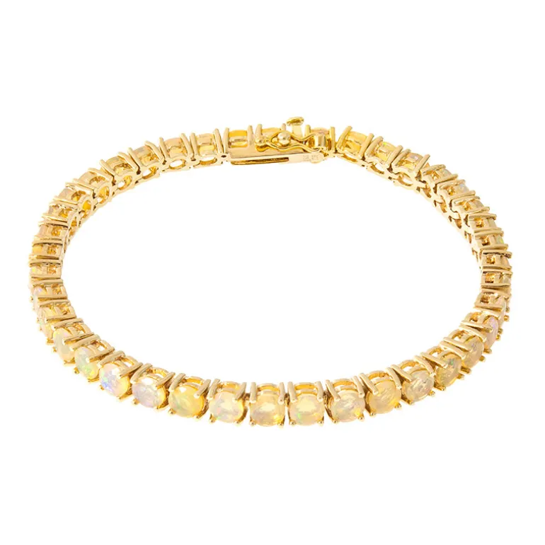 Entdecken Sie die Faszination des Armbands Welo Opal 375 Gold mit 40 äthiopischen Opalen im Rundschliff von insgesamt 6,8 Karat. Das in Deutschland aus 9-karätigem Gelbgold gefertigte Armband vereint Eleganz und leuchtende Farben und ist perfekt für jede anspruchsvolle Garderobe. Es ist ideal für besondere Anlässe oder für den Alltag und lässt sich wunderbar mit Abend- oder Geschäftskleidung kombinieren.