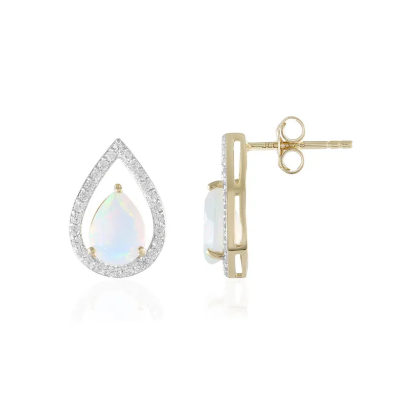 Diese exquisiten Welo-Opal-Ohrringe sind mit atemberaubenden äthiopischen Edelsteinen besetzt, die in 375er Gold gefertigt wurden. Die ätherischen Opale, die in einer faszinierenden Tropfenform geschliffen sind, werden wunderschön durch kambodschanische Zirkone ergänzt, die einen zusätzlichen Glanz verleihen. Sie sind ideal, um die Abendgarderobe aufzuwerten oder einen Hauch von Eleganz in Ihren Alltagslook zu bringen. Perfekt für besondere Anlässe, sind diese Ohrringe ein echtes Statement.