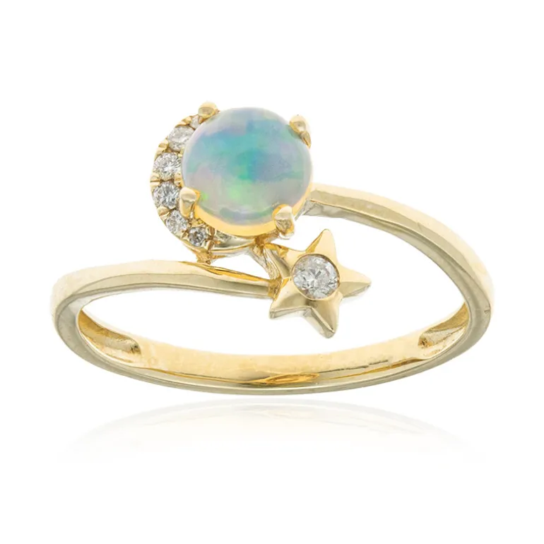 Genießen Sie das bezaubernde Farbenspiel dieses Rings mit äthiopischem Welo-Opal, der in glänzendem 14 Karat Gelbgold gefasst ist. Der Hauptedelstein, ein Opal im Cabochon-Schliff mit einem Gewicht von 0,582 ct, versprüht einen schillernden Charme, der durch funkelnde Diamanten mit einer Reinheit von I1 von insgesamt 0,081 ct ergänzt wird. Das skurrile Design ist sowohl modern als auch zeitlos und eignet sich perfekt, um Ihrer Kleidung einen raffinierten und doch verspielten Touch zu verleihen. Er ist ein idealer Gesprächspartner für gesellige Runden oder ein auffälliges Accessoire für besondere Anlässe.