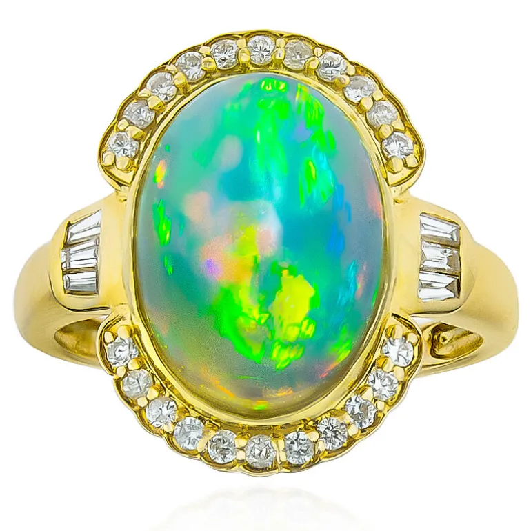 Dieser opulente Ring aus 14-karätigem Gelbgold wurde mit der mystischen Anziehungskraft des äthiopischen Welo-Opals gefertigt und besticht durch einen ovalen Cabochon mit einem Gewicht von 4,497 Karat, der von funkelnden Diamanten mit einem Gesamtgewicht von 0,362 Karat umgeben ist. Mit seinen beeindruckenden Maßen von 27 x 21 mm glänzt er mit einem irisierenden Farbspiel, das für Opale der Spitzenklasse steht. Dieser Ring von CIRARI eignet sich perfekt für besondere Anlässe oder als eleganter Alltagsschmuck und ist ein Zeugnis für Handwerkskunst und Luxus.