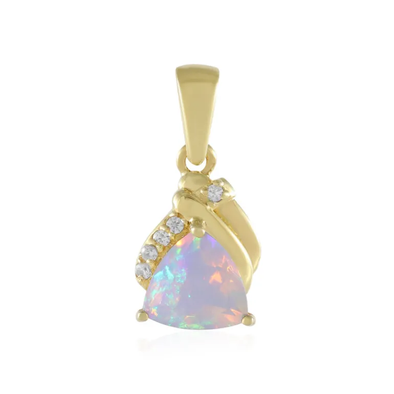 Dieser exquisite Anhänger zeigt einen bezaubernden Welo-Opal im Trilliant-Schliff aus Äthiopien, der von fünf funkelnden Zirkonen aus Kambodscha akzentuiert wird. Er ist aus 925er Sterlingsilber mit einer glänzenden Goldplattierung gefertigt, wiegt 1,59 g und hat ein Gesamtkaratgewicht von 0,632 ct. Er eignet sich perfekt für formelle Anlässe oder zur Aufwertung des Alltags und passt sowohl zu Freizeit- als auch zu Abendgarderobe.