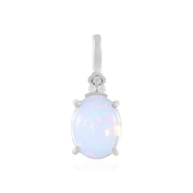 Dieser exquisite Anhänger zeigt einen bezaubernden äthiopischen Welo-Opal im ovalen Cabochon-Design, der von drei runden kambodschanischen Zirkonsteinen akzentuiert wird. Er ist aus platiniertem 925er Sterlingsilber gefertigt und bietet eine moderne Eleganz. Er eignet sich sowohl für legere als auch für formelle Anlässe. Kombinieren Sie ihn mit Ihrem Lieblingsoutfit, um ihm einen Hauch von Raffinesse und ätherischer Schönheit zu verleihen. Ein atemberaubendes Stück für jede Schmucksammlung.