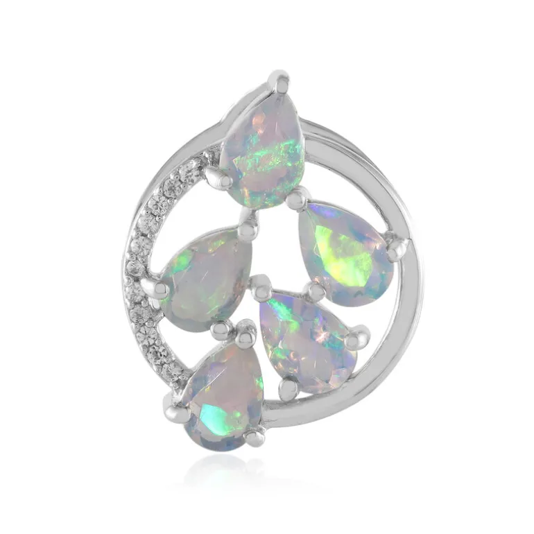 Entdecken Sie die bezaubernde Schönheit dieses Anhängers aus Sterlingsilber, der mit fünf faszinierenden Welo-Opalen aus Äthiopien von insgesamt 1,09 Karat besetzt ist. Ihre Birnenform verleiht ihnen einen ätherischen Glanz, der durch 11 funkelnde Zirkone aus Kambodscha ergänzt wird. Dieser Anhänger eignet sich sowohl für legere als auch für elegante Anlässe. Er passt zu jedem Outfit und verleiht Ihrem Look einen Hauch von Magie.