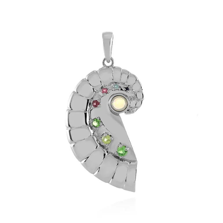 Entdecken Sie die Faszination dieses spiralförmigen Multicolor-Edelsteinanhängers mit einem strahlenden äthiopischen Welo-Opal in der Mitte, der von einem Kaleidoskop aus Tsavoriten, Peridot und Rhodolithen ergänzt wird. Der Anhänger aus glänzendem 925er Sterlingsilber mit Platin-Finish wiegt etwa 4,8 Gramm und funkelt mit einem Edelsteingewicht von insgesamt 0,536 Karat. Sein spiralförmiges Design, das an die Geheimnisse des Kosmos erinnert, ist mit sorgfältig ausgewählten Edelsteinen aus Tansania, China und Indien besetzt, die alle perfekt geschliffen sind. Dieses Schmuckstück misst 45×22 mm und ist ideal, um jedem Outfit einen Hauch von Eleganz zu verleihen. Ob am Abend oder in der Freizeit, dieser Anhänger wird alle Blicke auf sich ziehen und Ihren Look zum Leuchten bringen.