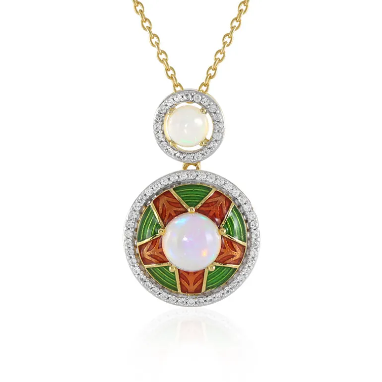 Entdecken Sie die bezaubernde Anziehungskraft dieser vergoldeten Halskette aus 925er Sterling Silber, die mit opulenten äthiopischen Welo-Opalen von insgesamt 1,426 Karat besetzt ist. Die runden Cabochon-Opale mit einer Größe von 7 mm und 5 mm werden durch 62 funkelnde Zirkone aus Kambodscha ergänzt, die alle harmonisch in einen atemberaubenden 26 x 17 mm großen Anhänger eingefasst sind. Mit einer Länge von ca. 45,5 cm verkörpert dieses Schmuckstück die Essenz des Luxus und ist perfekt geeignet, um jedes Outfit aufzuwerten, sei es für einen legeren Brunch oder eine elegante Soiree.