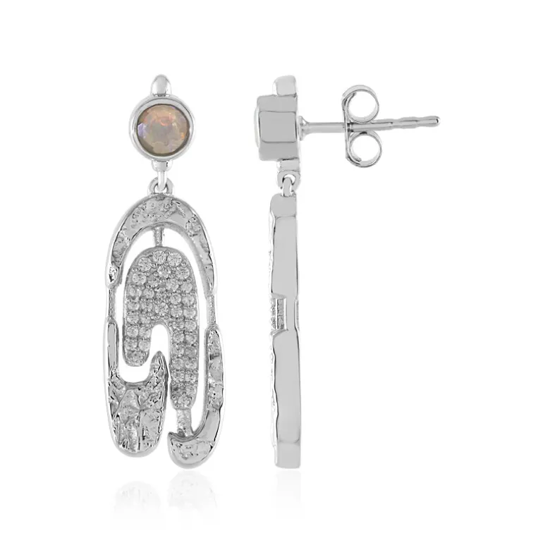 Diese atemberaubenden Ohrringe sind ein Meisterwerk des Funkelns. Sie sind mit äthiopischen Welo-Opalen und funkelnden Zirkon-Akzenten aus Kambodscha besetzt. Sie sind in platiniertem 925er Sterling Silber gefasst und wiegen ca. 5,28 g. Mit einem Gesamtkaratgewicht von 0,582ct verkörpern diese Ohrringe moderne Eleganz. Sie eignen sich perfekt, um jedem Abendoutfit oder besonderen Anlass einen Hauch von Glamour zu verleihen. Mit einer Länge von 31 mm sind sie auffällig und dennoch raffiniert.