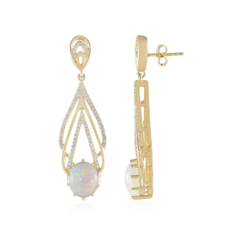Diese atemberaubenden Ohrringe zeigen faszinierende Welo-Opale aus Äthiopien, die durch funkelnde Zirkone aus Kambodscha ergänzt werden. Gefertigt aus vergoldetem 925er Sterlingsilber, strahlen sie Eleganz und Raffinesse aus. Perfekt für einen glamourösen Abend oder einen eleganten Tageslook, verleihen diese Ohrringe jedem Outfit einen Hauch von Luxus. Kombinieren Sie sie mit einem eleganten Kleid für ein unvergessliches Ensemble.