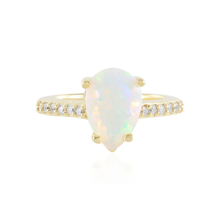 Dieser atemberaubende Ring besteht aus einem tropfenförmigen äthiopischen Welo-Opal von 1,377 Karat, der ein schillerndes Farbenspiel ausstrahlt. Er ist in vergoldetes 925er Sterling Silber gefasst und wird von zwölf funkelnden Zirkonen aus Kambodscha mit einem Gesamtgewicht von 0,239 Karat verziert. Mit einer Größe von 26 x 21 mm vereint dieses Schmuckstück Eleganz und Opulenz und eignet sich ideal für elegante Anlässe oder als raffinierter Begleiter für den Alltag. Der einzigartige Opal im Tropfenschliff sorgt für Gesprächsstoff, denn er reflektiert bei jeder Bewegung der Hand ein Spektrum von Farben.