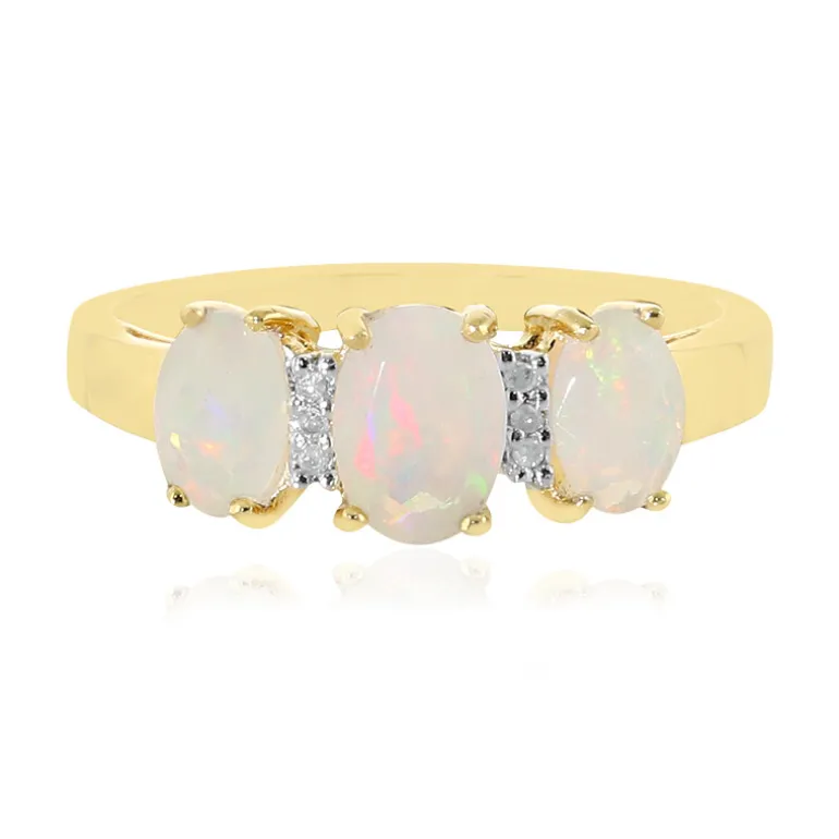 Entdecken Sie das bezaubernde Farbenspiel dieses Rings aus vergoldetem 925er Sterlingsilber mit einem Trio aus äthiopischen Welo-Opalen im Ovalschliff von insgesamt 0,747 Karat, die von sechs zierlichen Diamanten akzentuiert werden. Das zauberhafte Schillern der Opale wird durch den warmen Schimmer der Goldplattierung ergänzt und sorgt für einen faszinierenden Effekt. Dieser Ring eignet sich perfekt für Cocktailabende oder als raffiniertes Alltags-Accessoire und verleiht jedem Outfit einen Hauch von Glamour. Sein einzigartiges Funkeln zieht Bewunderer an und sorgt für Gesprächsstoff über Ihren exquisiten Geschmack in Sachen Schmuck.