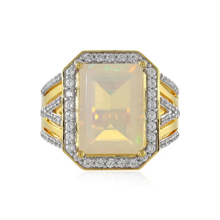 Entdecken Sie das Strahlen des äthiopischen Welo-Opals, der im Mittelpunkt dieses exquisiten Rings aus vergoldetem 925er Sterlingsilber steht. Der 3,717 Karat schwere Edelstein im Oktagon-Schliff mit seinem verführerischen Kaleidoskop von Farben wird von glitzernden Zirkonen aus Kambodscha mit einem Gesamtgewicht von 0,781 Karat eingerahmt. Das geometrische Design verleiht ihm ein modernes Flair und macht ihn zu einem auffälligen Schmuckstück für jede Gelegenheit. Dieser Ring ist perfekt geeignet, um sowohl der Tages- als auch der Abendgarderobe einen Hauch von Eleganz zu verleihen und sorgt für Gesprächsstoff.